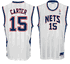 The Vince Carter New Jersey Nets Tackle Twill Embroidered Swingman Replica Basketball Jersey By Reebok has a body with a 2” drop tail made from a 5.3 oz. 100% Polyester Mesh and duplicates the Team On Court Jersey. The NBA Swingman Basketball Jersey features a screen printed Tackle Twill front New Jersey Nets word mark on the chest, his last name on the upper back, his team number 15 on both the front and back center, an embroidered NBA Logo and Reebok Vector on the upper left shoulder, and a stitched lower left hem NBA/Reebok jock tag.